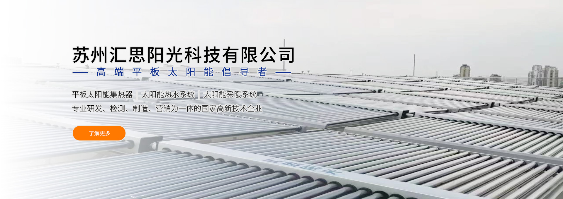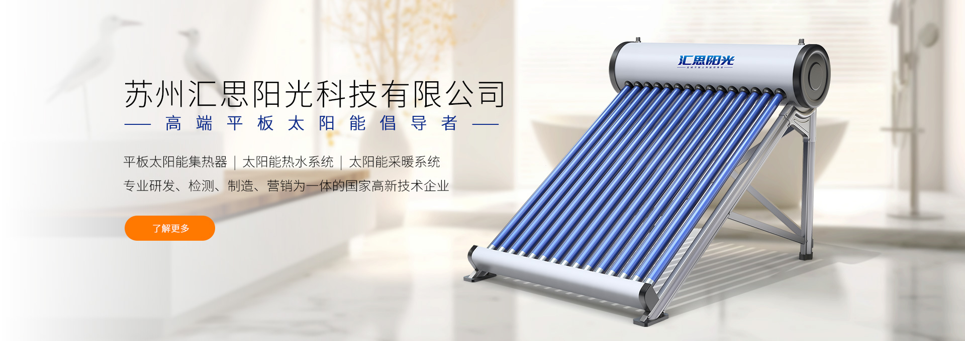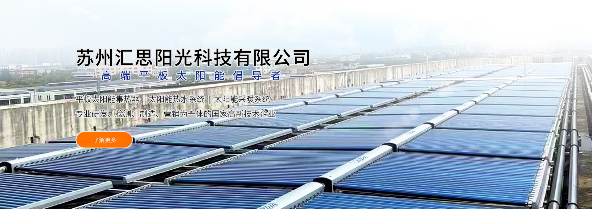 蘇州匯思陽光科技有限公司位于交通便利、環境優美的蘇州工業園區。公司是集平板太陽能集熱器、太陽能熱水系統、太陽能采暖系統等建筑一體化產品的專業研發、檢測、制造、營銷為一體的國家高新技術企業。 公司采用原裝進口藍鈦板芯,引進歐美成熟的平板太陽能熱水系統生產設備和技術,先進的檢測手段和生產工藝。具有年生產十萬套平板太陽能系統規模的生產能力并掌握核心知識產權,擁有發明、實用新型外觀設計等多項專利。公司產品在行業內率先獲得SOLAR KEYMARK(歐盟)、SRCC(美國)、CE(歐盟)國外專業認證,國內權威金太陽認證、ISO9001-2008質量管理體系認證,康居認證等并有著良好的海內外客戶信譽,產品遠銷歐洲、北美洲等30多個國家和地區。 在企業發展過程中,公司秉承以環保、健康為出發點,以“與地球和諧相處,...